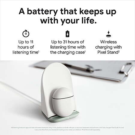 Meet Google Pixel Buds Pro with premium immersive sound that adapts to you. Active Noise Cancellation with Silent Seal™ blocks outside sounds so music shines while Volume EQ automatically adjusts the tuning to sound balanced at every level.1 Ask Google for hands-free help on the go.2 And get up to 11 hours of listening time – and up to 31 with the charging case.6