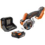 RIDGID introduces the 18V SubCompact Brushless Cordless 3 in. Multi-Material Saw Kit with (3) Cutting Wheels, 2.0 Ah Battery, and 18V Charger. This 18V SubCompact Brushless Cordless 3 in. Multi-Material Saw delivers multi-material cutting capability in an ergonomic package, optimized for 1-handed use. The Brushless Motor offers more runtime and longer motor life. All RIDGID 18V SubCompact Brushless tools, including this multi-material saw, are 100% compatible with all RIDGID 18V tools and batteries. The included 2.0 Ah Battery and 18V Charger are compatible with all RIDGID 18V Tools. This kit is backed by the Industry's Only Lifetime Service Agreement, simply register within 90 days of purchase for FREE Parts, FREE Service, For LIFE. The 18V SubCompact Brushless Cordless 3 in. Multi-Material Saw includes a metal cut off wheel, a diamond tile wheel, a carbide abrasive wheel, rotating upper guard, adjustable wire guide, LED light, hex key, a 2.0 Ah Battery, an 18V Charger, and an operator's manual.