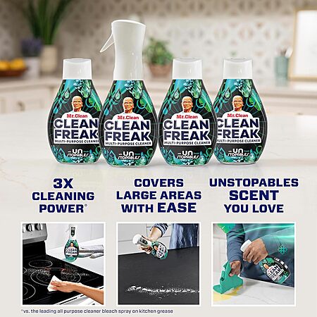This Mr. Clean bundle includes a 16 fl oz starter kit bottle with a Power Nozzle and three 16 fl oz refill bottles, offering a total of 64 fl oz. It delivers 3 times the cleaning power compared to leading bleach sprays, cutting through dirt on contact. The versatile cleaning mist is suitable for various surfaces, from kitchen countertops to shower tiles. The Power Nozzle allows for both continuous and precise spraying, and it's easy to switch between bottles. The product features a fresh Unstopables scent.