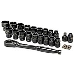 10mm, 11mm, 12mm, 13mm, 14mm, 15mm, 17mm, 18mm, 19mm, 3/8, 7/16", 1/2", 9/16", 5/8", 11/16", 3/4", 13/16", and 7/8". The set also features a 3/8" drive bit adapter socket turning the ratchet into a bit driver".