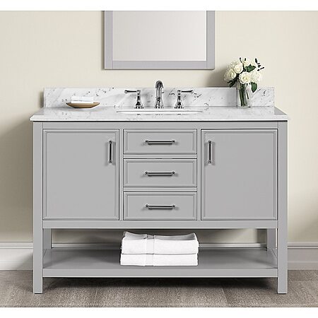 YMMV, but my Lowe's (Tustin, Ca) has a crap-ton of open box vanities ranging from dual to single sinks for clearance.