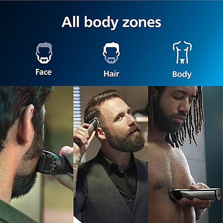 The Philips Norelco Multigroom Series 7000 is a versatile grooming kit designed for all-in-one hair and beard trimming. With 23 pieces, including specialized combs for intimate areas, it's perfect for face, head, and body grooming. The precision trimming guard offers adjustable length settings from 1 to 7mm for a personalized trim, while Smart BeardSense technology adjusts power based on beard density for optimal performance. Its titanium-coated, self-sharpening blades ensure durability without the need for oiling. The durable steel frame, rubber grips, and long-lasting lithium-ion battery provide up to 5 hours of runtime. The kit includes a Multigroom handle, attachments, and a USB-A charging cable (power adapter not included).