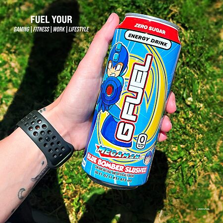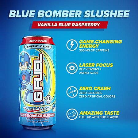 /''Dr. Wilyâs at it again Itâs time to charge up your Mega Buster & take down his sinister mechanical creations But you need energy if youâre going to take down all of them. You reach for an Energy Tank, & inside you find G FUEL Blue Bomber Slushee 16 oz Can With a refreshingly sweet taste reminiscent of an icy blue raspberry slush, you could have a MEGA burst of energy to help you take down all the Robot Masters FEATURES: 16 Oz. Carbonated Can 300 Mg Caffeine Zero Sugar + Zero Calories S7 Complex (Ketones)/''