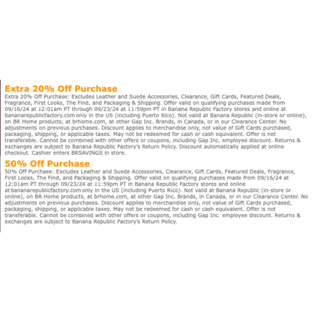 From September 16, 2024, at 12:01am PT through September 23, 2024, at 11:59pm PT, Banana Republic Factory is offering 50% off qualifying purchases and an additional 20% off on top of that. This promotion is available both in-store and online at bananarepublicfactory.com in the US and Puerto Rico. However, it excludes leather and suede accessories, clearance items, gift cards, featured deals, fragrance, First Looks, The Find, and packaging & shipping costs. The discount does not apply to previous purchases, and it cannot be combined with other offers or employee discounts. It is not valid at Banana Republic, BR Home products, or other Gap Inc. brands, and it is not applicable in Canada or Clearance Centers. The discount applies to merchandise only and will be automatically applied at online checkout or entered as BRSAVINGS at the register in-store. Returns and exchanges will follow Banana Republic Factory's Return Policy.