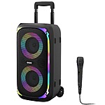 Picture dynamic LED lights that pulse and groove with the rhythm, turning any space into a vibrant dance club. This Bluetooth speaker has the kind of ambiance that gets everyone in the groove and transforms any gathering into an unforgettable celebration. The included microphone lets you sing your heart out anywhere, anytime.