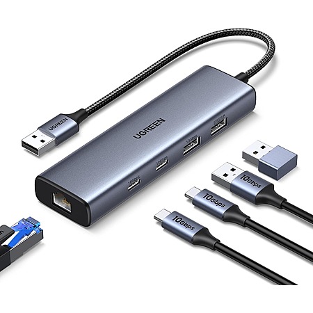 Model: UGREEN USB to Ethernet Adapter, 5 in 1 USB Hub with Ethernet with 2* USB-C 3.2 (10Gbps) + 1*USB-A 3.2/1*USB-A 2.0/Gigabit RJ45, USB to Network LAN Internet Dongle for Laptop, MacBook Pro/Air, XPS