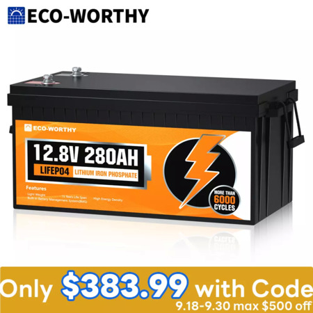 12-Volt 280AH Eco-Worthy LiFePo4 Lithium Iron Phosphate Battery w/ 6000 Cycles on sale for $479.99 - 20% off when you apply promo code