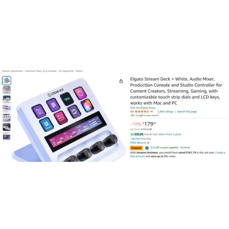 There's a $10 coupon off a Stream Deck + White making the price $179.99 - $10.00 = $169.99.