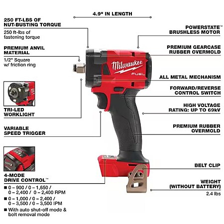 • 4-mode drive control provides greater control over output speed and power, includes auto shut-off and bolt-removal mode