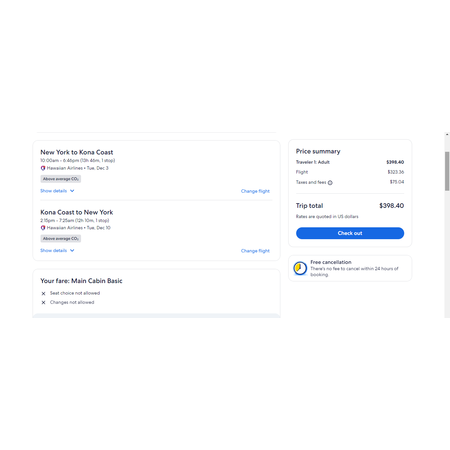 Hawaiian Airlines and Expedia have round trip airfares travelling to and from New York (JFK) and Kailua-Kona Hawaii (KOA) for $399, making 1 stop both ways. These are basic economy fares that allow a personal item and a carry-on bag. There is no seat selection and no change. If you are travelling with children, you will be seated together as per HA's policy.