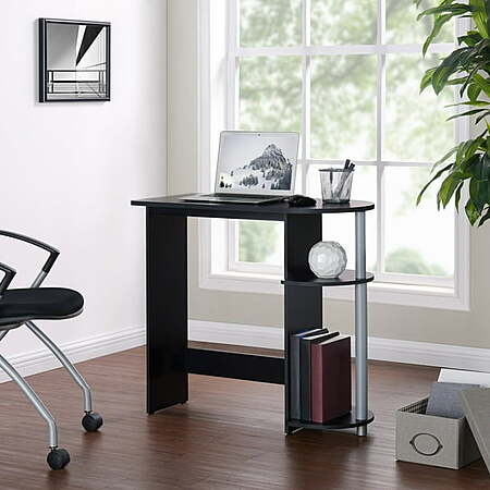 Upgrade your home office to enjoy greater productivity with the Mainstays Large 28.86" Computer Desk with a Black Finish. This classic desk will make a great addition to your home's study, work area, or even bedroom. The durable design is made with a dynamic black finish that will coordinate easily with a wide range of color palettes and interior design aesthetics. Even if you aren't quite Martha Stewart, the timeless design of this desk will make it look like your room was pulled from the pages of a catalog. The desk helps you to economize the area of your living space and features a smooth surface that is perfectly sized to hold your laptop or monitor and keyboard. Underneath, the desk has two sturdy curved shelves so you can store your computer tower, writing utensils, books, and others to work and study materials. Position the desk against a wall or in front of a window so you can enjoy a view as your work diligently on your latest work, school, or personal project. This designated workspace will become your haven of productivity, where you can come to tackle items on your to-do list.