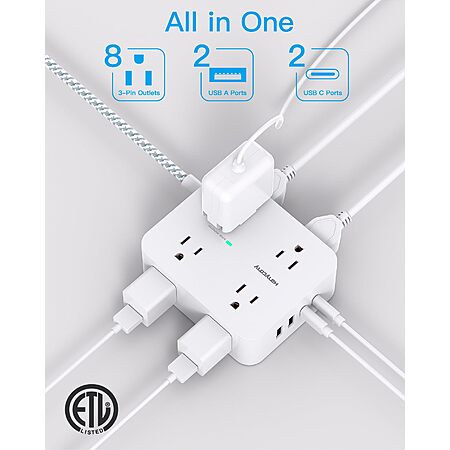 Surge Protector Power Strip - 8 Outlets with 4 USB (2 USB C) Charging Ports, Multi Plug Outlet Extender, 5Ft Braided Extension Cord, Flat Plug $9.99
