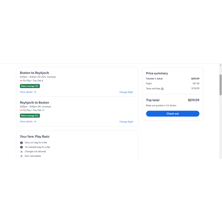 Play Airlines, an ultra low-cost 'no frills' Icelandic low-cost airline via Expedia have round trip airfares travelling from Boston (BOS) to Reykjavik Iceland Keflavik (KEF) for $220, nonstop. These fares are basic economy fares that only include a small personal item. There is no seat selection, no carry-on bag and no change. You do have an option to pay for additional services.