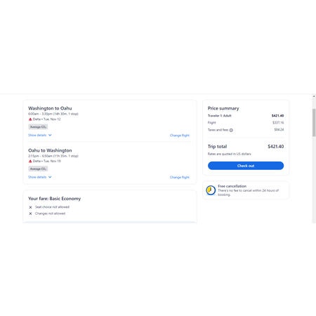 Delta Air Lines have round trip airfares travelling to and from Washington DC (IAD) and Honolulu Hawaii (HNL) for $422, making 1 stop. These are basic economy fares that include a personal item and a carry-on bag. There is no seat selection and no change.