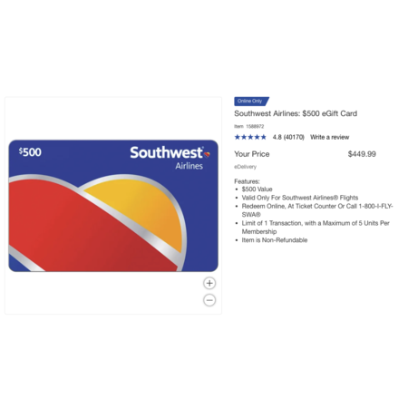 Costco: Southwest Airlines $500 eGift Card for $450 (online only)
