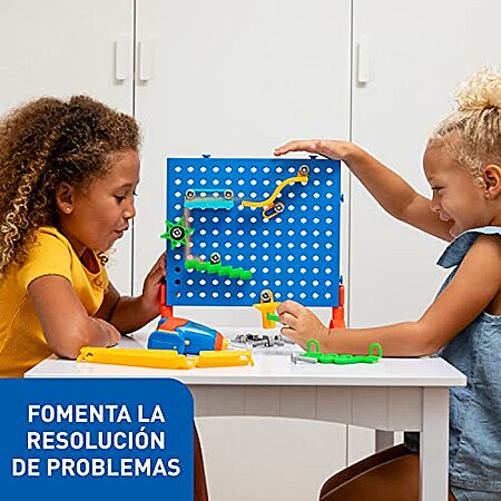 • Use a kid-friendly power drill and colorful bolts to attach 15 track pieces of varying lengths and shapes to complete 10 different maze challenges
