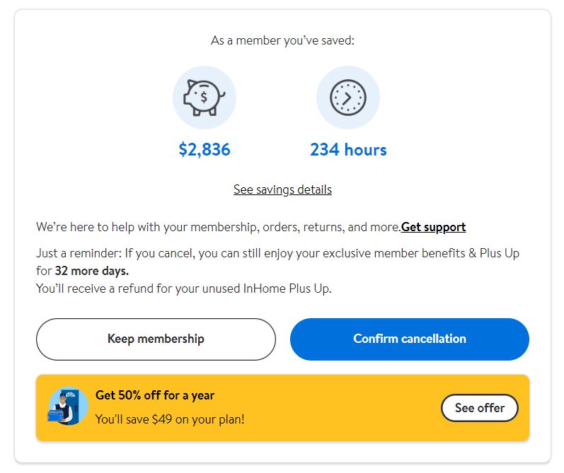 Walmart is offering Select Existing Walmart+ Members: Attempt to cancel your Walmart+ annual membership and get 50% Off your next Walmart+ Membership renewal (pay just $49). A web browser is required to see this offer - this offer does not appear on the Walmart app.