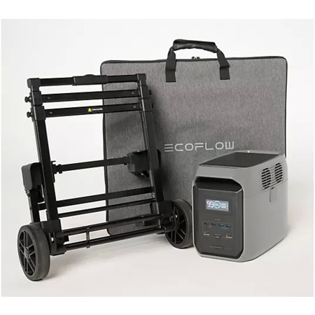 - Includes Delta 3 power station, car charging cable, AC charging cable, and DC5521 to DC5525 cable; trolley; 160W NextGen solar panel with storage case and charging cable