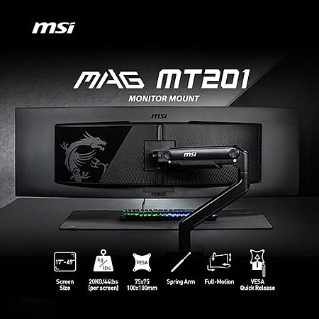 Model: MSI MAG MT201 - Premium Heavy Duty Single Monitor Stand Arm, Supports 17-49" Screens and 44 lbs, VESA Compatible, Adjustable Spring Assisted Mount, Clamp & Grommet, Quick Release Plate - Black