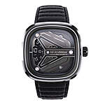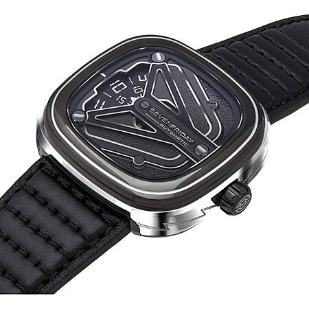 SevenFriday M3-08 men's M-Series automatic silver tone case watch is offered, in a black ceramic and solid stainless steel case. This model is made in dimensions of 48mm across and 12mm high with a lug-to-lug measurement of 47mm. This watch has a fixed bezel and a textured push/pull main crown. SevenFriday M3-08 is fitted with a stitched black straight cut and motorbike seat style padded genuine calf skin leather strap. Securing the strap is a pin buckle clasp made in stainless steel.