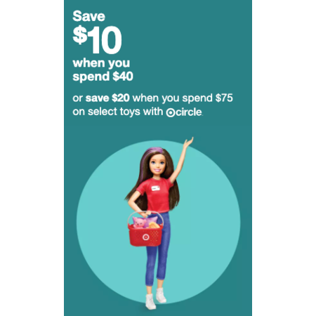 Target Toys save $10 with $40 toy purchase or $20 with a $75 toy purchase.