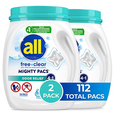 112-Count All Mighty Pacs Laundry Detergent (Free Clear Odor Relief) $21.95 w/ S&S + Free Shipping w/ Prime or on $35+