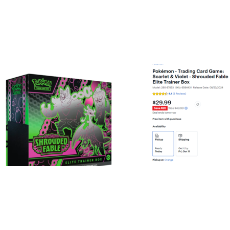 Best Buy has Pokémon Trading Card Game: Scarlet & Violet Shrouded Fable Elite Trainer Box on sale for $29.99. Select free store pick up where stock permits otherwise shipping is $5.99.