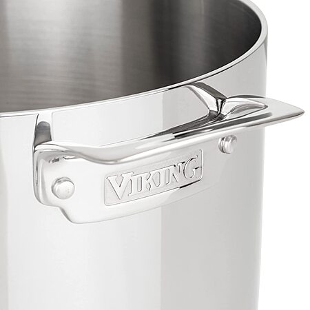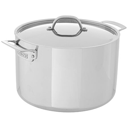 The Viking 3-Ply Stainless Steel 12-Quart Stock Pot with Metal Lid helps to achieve rolling boils in a shorter time frame than conventional stockpots, making it ideal for preparing pastas or soups.