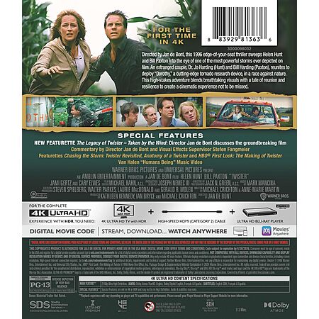 A mile-wide, 300 miles-per-hour force of total devastation is coming at you! In this adventure swirling with cliffhanging excitement and awesome special effects, Helen Hunt and Bill Paxton play scientists pursuing the most destructive weather front to sweep through mid-Americas Tornado Alley in 50 years. By launching electronic sensors into the funnel, the storm chasers hope to obtain data to create an improved warning system. But to do so, they must intercept the twisters deadly path. The chase is on!