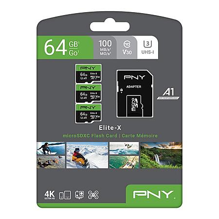 PNY 64GB Elite-X Class 10 U3 V30 microSDXC Flash Memory Card, 3 Count $15.99 @ Amazon