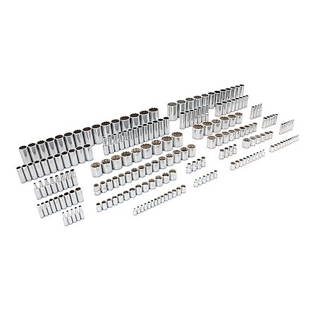 - 212-Piece socket set includes a wide selection of shallow and deep style sockets ideal for repair work