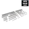 Contains fifty-two (52) 1/4-inch, sixty-six (66) 3/8-inch and ninety-four (94) 1/2-inch drive sockets
