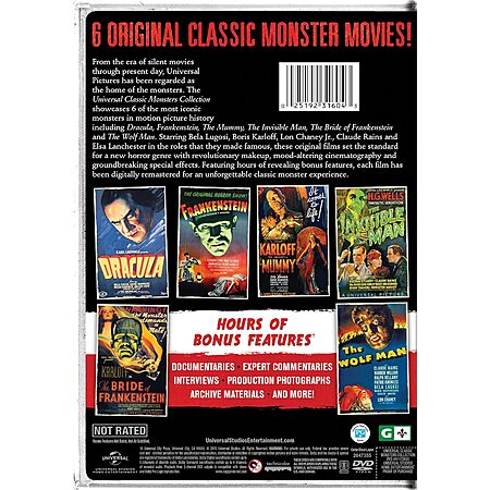 The Universal Classic Monsters Collection showcases 6 of the most iconic monsters in motion picture history including Dracula, Frankenstein, The Mummy, The Invisible Man, The Bride of Frankenstein and The Wolf Man.