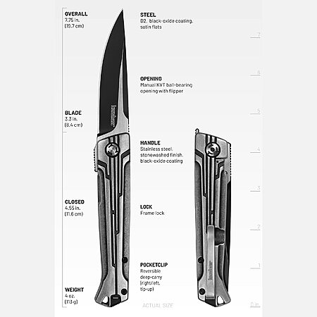 • Measures 7.75 inches open, 4.55 inches closed with a 3.3 inch blade length. Weighs 4.0 oz, a moderate knife weight.