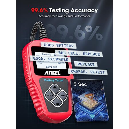 - 【Wide Compatibility, 99.6% Accuracy】The BA101 battery tester automotive offers a broad test range (100-2000 CCA) and exceptional 99.6% accuracy, outperforming its rivals. It adheres to multiple standards: JIS, EN, DIN, SAE, CCA, BCI, GB, CA, MCA, and IEC. This versatile tester is compatible with various battery types (including flooded, AGM, GEL, EFB) for cars, trucks, hybrids, SUVs, boats, RVs, and motorcycles. Meet all your battery testing needs with confidence.