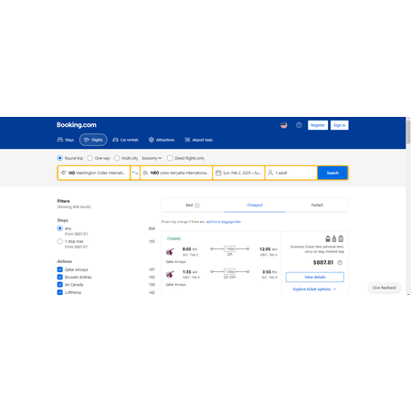 Skytrax rated 5 out of 5 stars for Worlds Best Airline, Qatar Airways via Booking.com have round trip airfares travelling from Washington DC (IAD) to Nairobi Kenya (NBO) for $888, making 1 stop in Doha for about 2.5 hours. These are economy classic airfares that include a personal item, a carry-on bag and 2 free checked bags.
