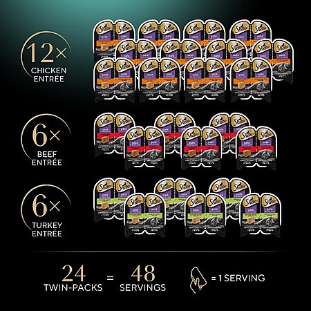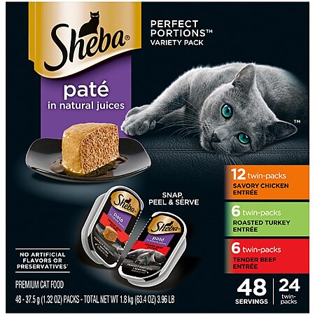- Sheba Perfect Portions Paté Wet Cat Food Variety Pack includes 24 twin-pack trays (48 servings total)