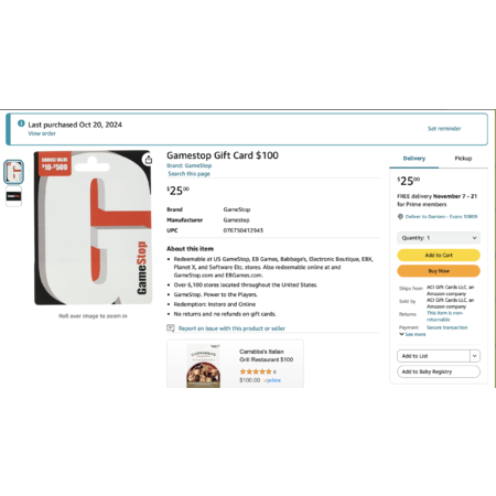 Note, product is sold/shipped by ACI Gift Cards, LLC, an Amazon company