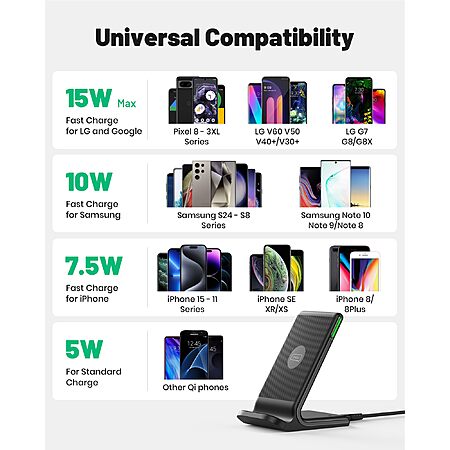 - 4 Upgraded Charging Modes: A high-efficiency chip provides 15W fast charge for LG, 10W fast charge for Samsung Galaxy, 7.5W fast charge for iPhone, and 5W standard charge for any other devices.
