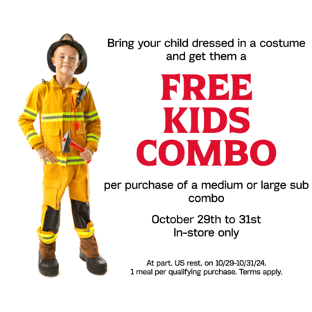 Firehouse Subs guests who visit a participating Firehouse Subs restaurant with a child 12 (or younger) dressed in a Halloween costume from 10/29-10/31/24 will receive a free kids combo meal with purchase of any medium or large sub combo meal ("Qualifying Purchase") (collectively, the "Offer"). Modifications and tax extra. At participating U.S. restaurants. Order must be placed in the restaurant. Not valid for digital orders, pick up, or delivery. Valid for one free kids' combo meal per Qualifying Purchase. Cannot be combined with any other deal, combo, or offer. Firehouse Subs reserves the right to cancel, suspend, and/or modify this Offer at any time with or without notice. Void where prohibited.