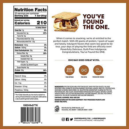 Model: ONE Protein Bars, Smores, Gluten Free Protein Bars with 20g Protein and only 1g Sugar, Guilt-Free Snacking for High Protein Diets, 2.12 oz , 12 Count (Pack of 1)