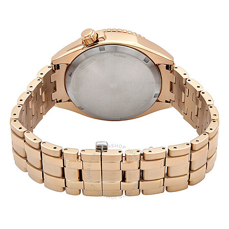- Black dial with rose gold-tone hands and index hour markers. Minute markers around the outer rim.