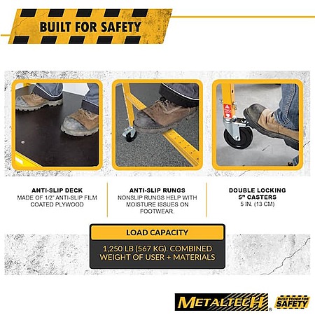 Your utmost safety is guaranteed when using the Safeclimb 6 ft. x 6.25 ft. x 2.5 ft. Steel Baker Style Scaffold Platform with Wheels, thanks to an anti-slip deck that has a climb-through opening and sturdy anti-slip rungs. Its heavy duty 5 inch caster wheels make it easy for rolling in any home project, such as painting drywall. It's adjustable to your preferred height at 2 in. increments and can allow the user to reach 12 ft high. The user can stack these Metaltech Bakers up to 3 units high to reach up to 24 ft. Its stable walk board has a load capacity of up to 1,250 lbs
