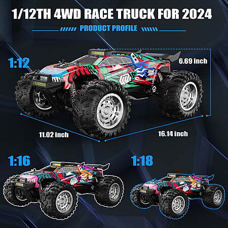 - 1:12 RC Truck Bigger Size? Ready When You Are: Our over-sized 1:12 RC car is significantly bigger than other mainstream models on the current market. The vehicle feels solid and pricey on hands. Equipped with big and wide tires, loaded with an aggressive low wind resistance truggy shell.Bigger size and modeling bring ultra realistic driving experience.