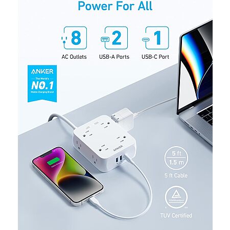 Anker 8 Outlet Surge Protector Power Strip with 2 USB A & 1 USB C Ports, 2000J, 5 Ft Cord (White) $14.4