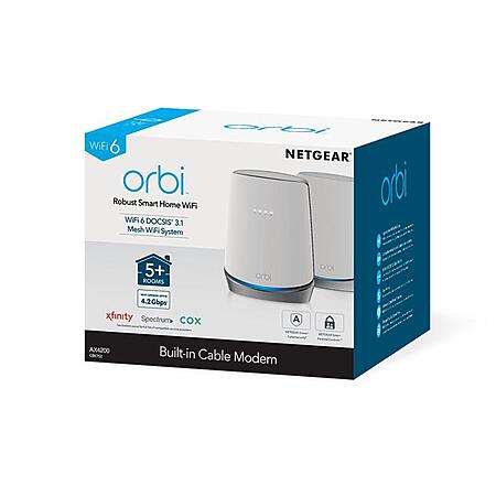 The Orbi Whole Home WiFi 6 System with DOCSIS®3.1 Built-in Cable Modem is an industry-first, two-in-one solution for ultra-fast Gigabit internet and whole-home WiFi 6 coverage. Cover up to 5,000 sq. ft. with speeds of up to 4.2 Gbps for over 40 devices.