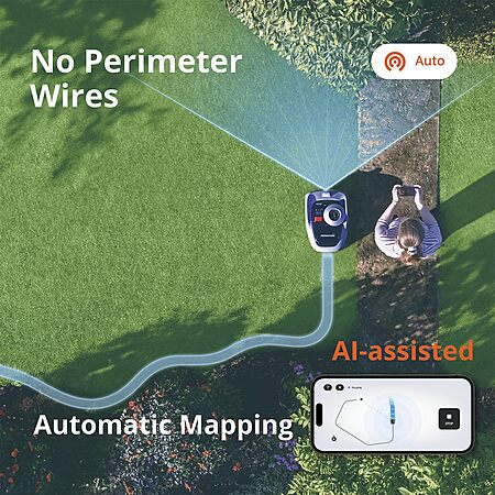 No Perimeter Wires & Automatic AI-assisted Mapping: Quick, wire-free setup in just a few taps, simply use your smartphone to guide Navimow and map out virtual boundaries around your lawn. Furthermore, with the revolutionary AI-powered Assist Mapping feature, Navimow identifies the clear edges of your lawn during mapping and automatically navigates and maps the entire working area, making setup easier than ever.
