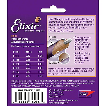 3-Pack Elixir Light Nanoweb Phosphor Bronze Acoustic Guitar Strings $34.99 + Free Shipping