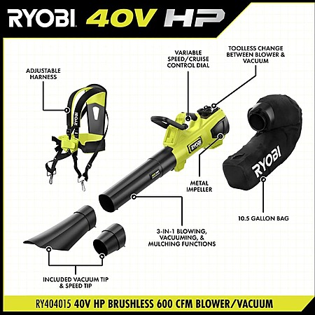 | Product Description: | The RYOBI 40V HP Brushless 600 CFM Blower/Vacuum Kit has 2X more power delivering the performance of gas without the hassle. Achieve over 25 minutes of runtime using (2) 40V 4Ah batteries. 40V HP technology combines a powerful brushless motor, advanced electronics, and lithium technology to deliver 600 CFM and 100 MPH, making the blower ideal for clearing damp/dry leaves & compacted grass. The vacuum function features a durable, internal impeller, giving you the power to mulch 20 bags of leaves down to 1. The variable speed cruise control dial allows you to effortlessly set and lock your desired speed, reducing fatigue during extended blowing and vacuuming applications. The speed tip increases air speed for even tougher jobs. Best of all, it is part of the RYOBI 40V System where any 40V battery works with any 40V product. This 40V Blower is backed by the 5-year manufacturer's tool warranty, 3-year manufacturer's battery warranty, and includes the RY404015 40V Blower/Vacuum, (2) OP40404 40V 4Ah Batteries, OP406 40V Rapid Charger, Blower Tube, Collection Bag, Vacuum Tip, Speed Tip, Shoulder Harness, and Operator's Manuals. |