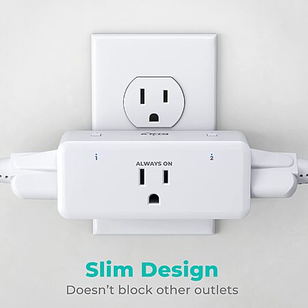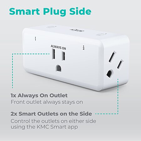 • KMC Smart Plug Side outlet splitter has 1 always-on outlet and 2 smart outlets that can be independently controlled from anywhere over Wi-Fi.